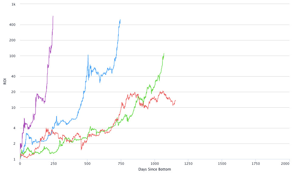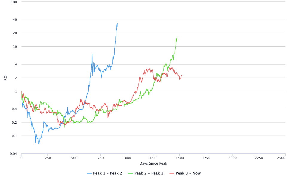 Another way we can show lengthening cycles is the bitcoin market cycle return on investment as measured from Peak to Peak:
